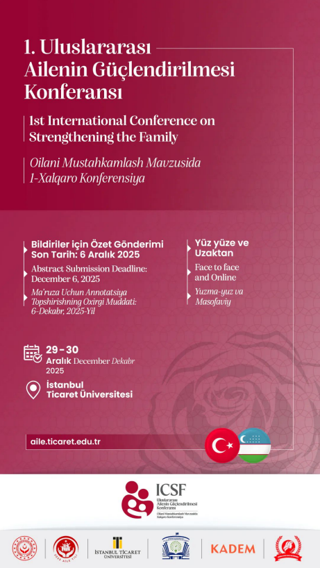 2025’in "Aile Yılı" ilan edilmesi, aile kurumunun farklı yönleriyle ele alınmasını ve bilimsel düzlemde incelenmesini her zamankinden daha önemli kılmıştır. Bu kapsamda, İstanbul Ticaret Üniversitesi ev sahipliğinde Kadın ve Aile Uygulama Araştırma Merkezi öncülüğünde 1. Uluslararası Ailenin Güçlendirilmesi Konferansı düzenlenecektir. Konferans T.C. Aile ve Sosyal Hizmetler Bakanlığı, Özbekistan Yükseköğretim, Bilim ve Yenilik Bakanlığı, Özbekistan Aile ve Kadın Komitesi, Kadın ve Demokrasi Vakfı (KADEM) ve Özbek Kadın Hakları Derneği iş birliğinde gerçekleştirilecektir.