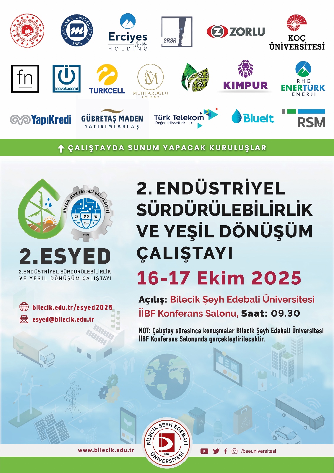 16-17 Ekim 2025 tarihleri arasında Bilecik Şeyh Edebali Üniversitesi ev sahipliğinde "2. Endüstriyel Sürdürülebilirlik ve Yeşil Dönüşüm Çalıştayı" yapılması planlanmıştır.