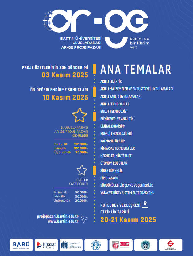 Bartın Üniversitesinin (BARÜ) paydaşlarıyla güç birliği içerisinde 2017 yılından bu yana düzenlediği Ar-Ge Proje Pazarı ile #MilliTeknolojiHamlesi’ne katkılar sunulmaya devam ediliyor. Bartın Üniversitesinde gelenekselleştirilen Ar-Ge Proje Pazarı etkinliğinde bugüne kadar ülkemizin farklı illerinden bilimsel kalkınmanın kaçınılmaz olduğuna inanan binlerce araştırmacı bir araya geldi. Dördüncü Sanayi Devrimiyle birlikte, ülkemizi daha ileriye taşımak hedefiyle BARÜ çatısı altında toplanan yarışmacılar ‘Benim de bir fikrim var’ diyerek projelerini sergiledi ve sektörden temsilcilerle birebir görüşme imkânına sahip oldu. Bu yıl sekizincisi gerçekleştirilecek Uluslararası Ar-Ge Proje Pazarını dünyanın farklı coğrafyalarından yükseköğretim kurumlarının ortaklığında düzenleyecek olmanın kıvancı yaşanmaktadır. Almanya’dan Saarland Üniversitesi, Azerbaycan’dan Hazar Üniversitesi, Bosna Hersek’ten Uluslararası Saraybosna Üniversitesi, Kuzey Kıbrıs Türk Cumhuriyeti’nden Uluslararası Final Üniversitesi, Malezya’dan Putra Üniversitesi, Özbekistan’dan Mamun Üniversitesi paydaşlığında yine birbirinden değerli araştırmacılara projeleriyle birlikte ev sahipliği yaparak ortak geleceğimize değer katılacağına yürekten inanılmaktadır. 20-21 Kasım 2025 tarihlerinde gerçekleştirilmesi planlanan BARÜ 8. Uluslararası ArGe Proje Pazarı için ayrıntılı bilgiye link üzerinden ulaşılmaktadır.