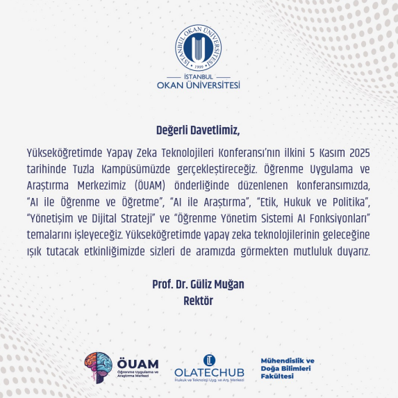 Yükseköğretimde Yapay Zeka Teknolojileri Konferansı’nın ilkini 5 Kasım 2025 tarihinde İstanbul Okan Üniversitesi Tuzla Kampüsünde gerçekleştirilecektir.