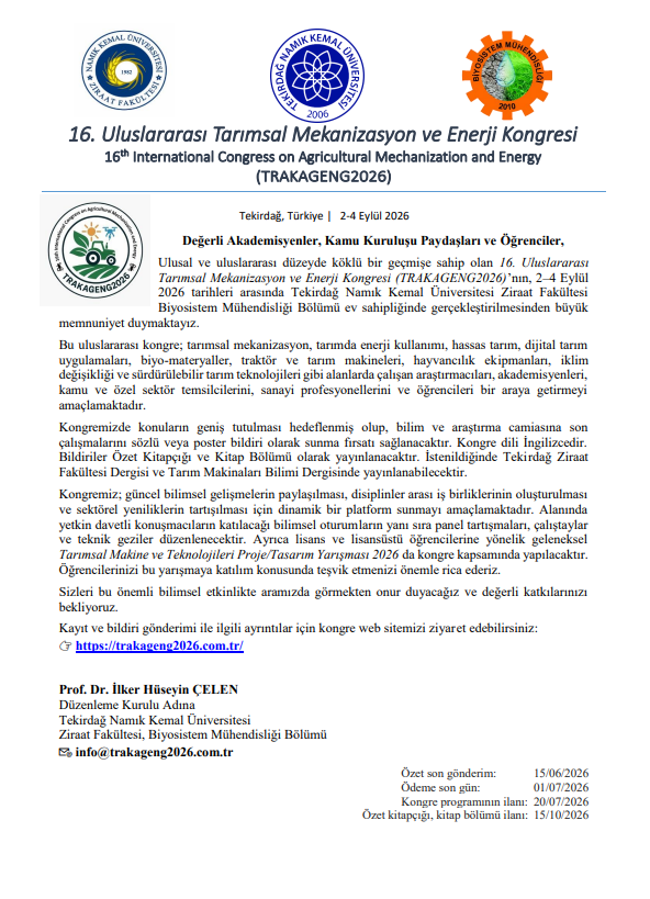 16. Uluslararası Tarımsal Mekanizasyon ve Enerji Kongresi (TRAKAGENG2026)